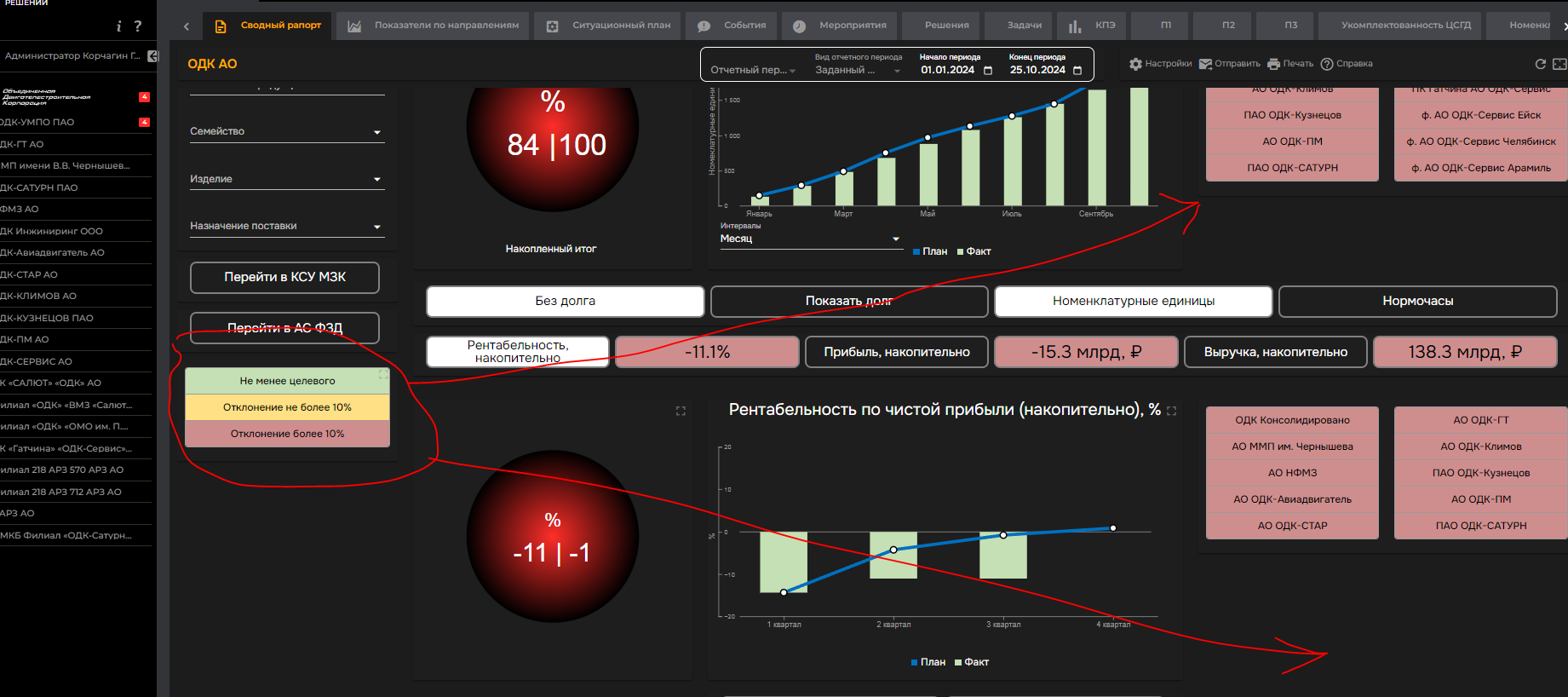 Легенда должна отображаться не слева, а под списком предприятий, согласно приложенному изображению. Для верхней и нижней группы показателей легенда может отличаться, поэтому её нужно продублировать.